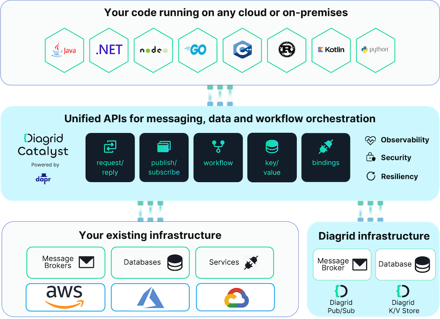One of the unique aspects of Catalyst is its ability to offer the flexibility of integrating diverse backing infrastructures for these APIs. Users have the choice to either rely on Diagrid-managed infrastructure or to connect their own infrastructure hosted with external cloud providers. At the same time, Catalyst addresses concerns about vendor lock-in by enabling the export of configurations into Dapr resource specifications. This feature allows for a smooth transition between Catalyst and open-source Dapr, supporting deployments in private Kubernetes clusters or other platforms. This dual compatibility streamlines the process of importing resources to Catalyst and exporting them back into Dapr, where applicable.