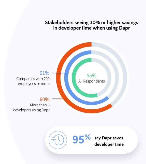 Almost all respondents (95%) say that Dapr saves developer time, and more than half (55%) reported seeing a savings in developer time of 30% or more when using Dapr.