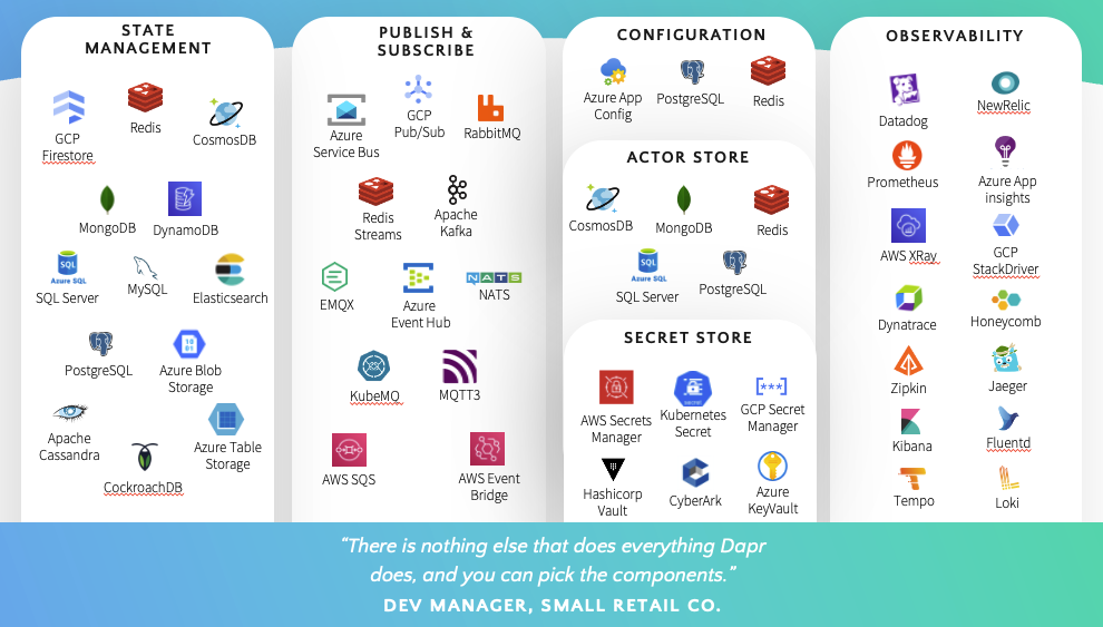 The beauty of Dapr building blocks is that they decouple applications from the underlying infrastructure and developers' code gets improved portability. Platform engineers can change the service used by a building block without requiring application code modifications, or a rebuild/redeploy. For example: the publish & subscribe building block can easily be switched from Redis to Kafka or any of the other 16 supported services. Services used by survey respondents are shown here.