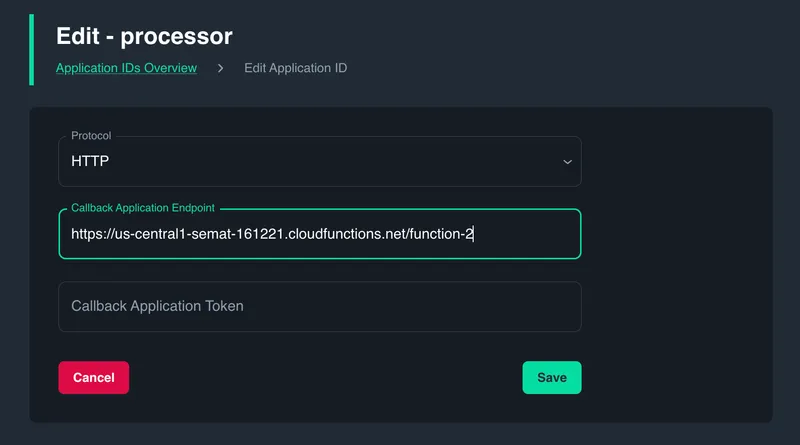 - On the App IDs page in the Catalyst console, select the processor App ID, and click on Edit Application ID in its right-hand context menu. Set the Callback Application Endpoint value to point to the unique URL of your Google function, and save the configuration.
