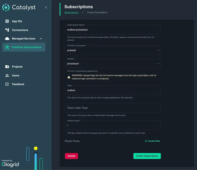 - Choose a name to the subscription, such as outbox-processor.