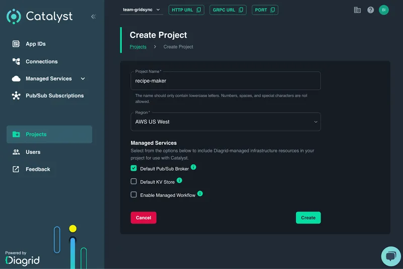 - Diagrid Catalyst: The platform that connects all the services together, acting as a key/value API with outbox and a managed PubSub service, to seamlessly integrate all disparate components. Catalyst offers a set of unified APIs for communication, data and workflow and is powered by open-source Dapr.