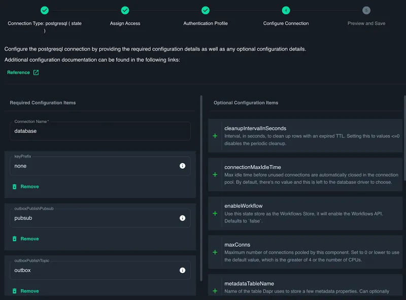 Catalyst has the concept of Connections as a higher-level abstraction for the underlying infrastructure including message brokers, data stores, and 3rd party services. By selecting the Connection menu on the left hand side, you will see the Default Pub/Sub Broker appear as a Connection with the name pubsub which we will use later to store outbox events.