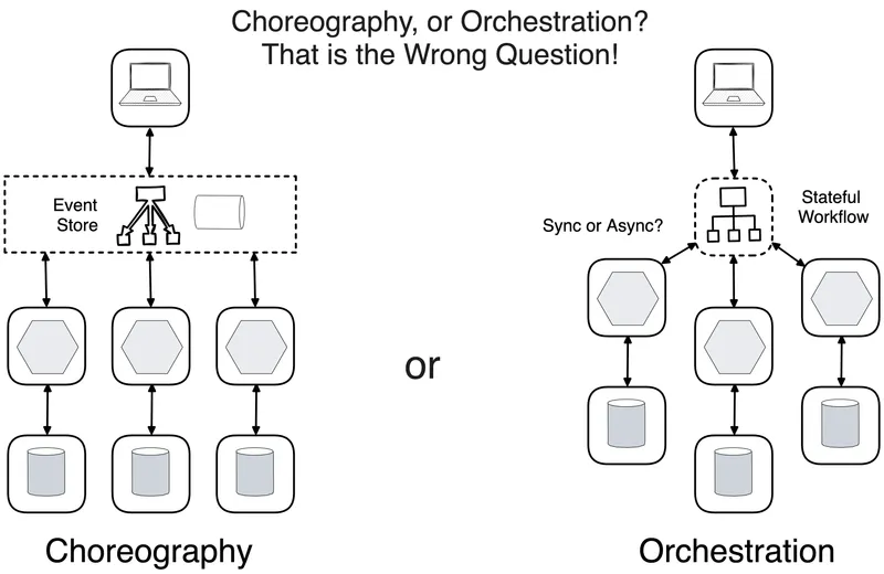 In today's tech landscape, microservices, functions, and serverless have become the benchmark for modern cloud architectures. As developers and tech leads navigate this space, one debate seems to persistently echo through blog posts, and conferences: choreography or. orchestration, which one is better for distributed application coordination? Dive into any tech discussion, and you'll find articles championing one over the other, each armed with a list of pros and cons, best fit scenarios. However, a closer look reveals that many of these discussions are influenced by the tools and platforms the authors are familiar with. The age-old "if you have a hammer, everything looks like a nail" argument is evident. Messaging vendors will passionately advocate for the decentralized, event-driven nature of choreography, painting it as the future. On the other hand, orchestration engine vendors will emphasize the clarity, control, and manageability that orchestration brings. It doesn't stop there. Service mesh advocates will highlight the benefits of real-time request/response driven interactions and API management, while stream processing fans will boost the virtues of event-driven architecture and schema registries.