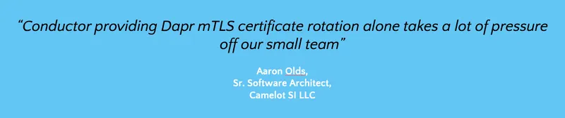To further lower the operational overhead of running Dapr on their AWS-deployed Kubernetes clusters, Camelot SI became an early adopter of Diagrid Conductor in 2022. The Camelot SI development team exclusively uses Conductor for upgrading Dapr and has reported that it saves the team more than an hour of valuable developer time for each cluster upgraded, with the added confidence of having guaranteed rollbacks in the event of any issues. Additionally, Conductor provides scheduled zero-downtime mTLS certificate rotation for their Dapr apps on their Kubernetes clusters, enabling development team members to focus on improving the business code and other higher value tasks, whilst giving them confidence in their security posture.