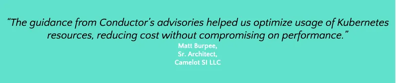 Right-sizing Kubernetes workloads is a complex ongoing task and one of the most frequent challenges an operations team encounters. Sidecar architectures, as used by Dapr, can be wastefully resource-intensive if not implemented correctly. To fix this, Conductor provides detailed Kubernetes performance advisories for setting the optimal memory and CPU requests and limits for Dapr-enabled apps and sidecars, including a 10% resource buffer. Camelot SI uses these advisories to set resource requests and limits on their services, improve their overall provisioning and reduce the cost of their Kubernetes clusters