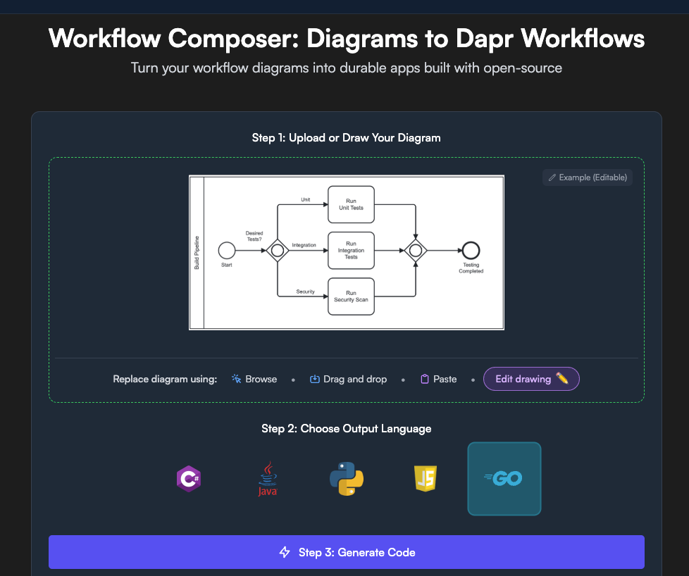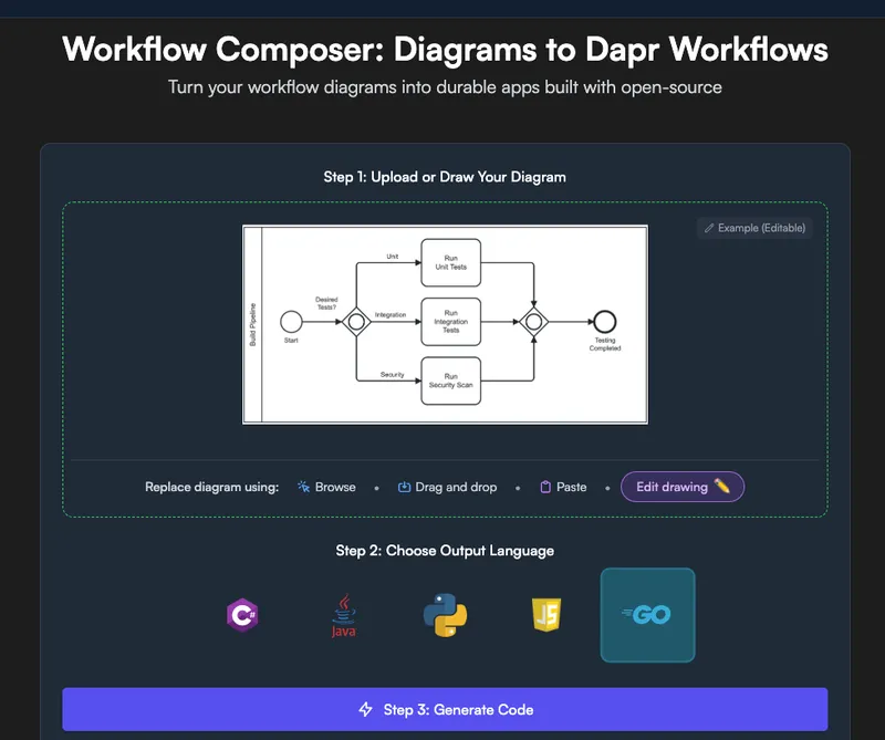 This post walks through how we designed Workflow Composer, a system that uses AI to transform workflow diagrams into ready-to-use Dapr Workflow applications for C#, Java, Python, Javascript, and Go. The architecture is built around the following key ideas:
