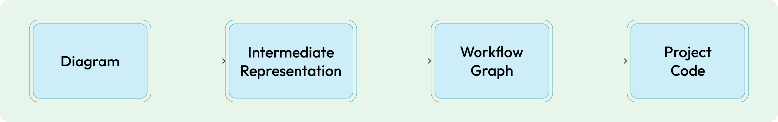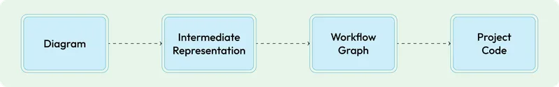 Workflow Composer bridges this gap. Instead of jumping from a diagram straight to code, it passes through an Intermediate Representation (IR). This is to alleviate LLM hallucinations, inaccuracies, and uncompilable code.