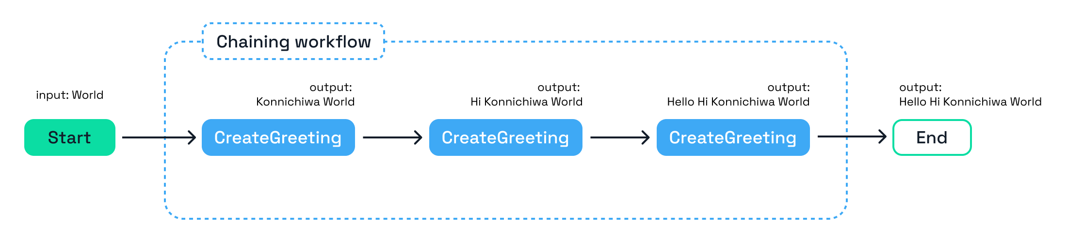 The ChainingWorkflow sample in the GitHub repo contains a sequence of three activity calls. In this workflow, a random greeting will be added to the input string. Each time the CreateGreetingActivity is called, the output of the activity is used as the input for the next activity.
