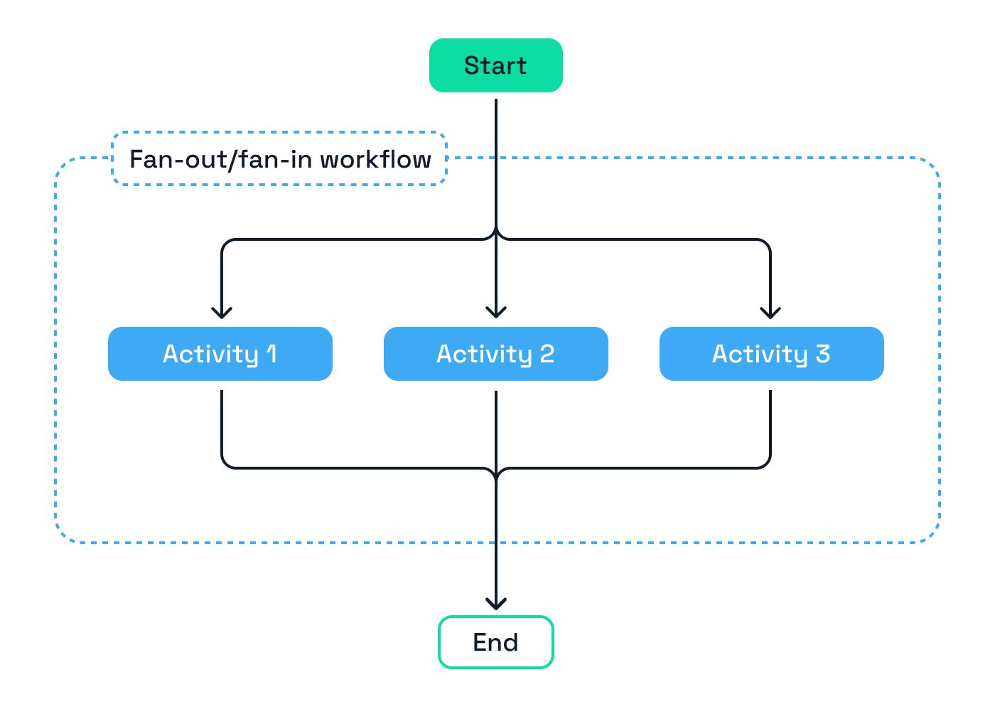 A use case where fan-out/fan-in is useful is processing arrays of data, like order items. A workflow is started where the input argument is an array of order items, the workflow iterates over the array and processes each order item individually. The workflow ends with an aggregate, such as the summation of the total price across all order items.