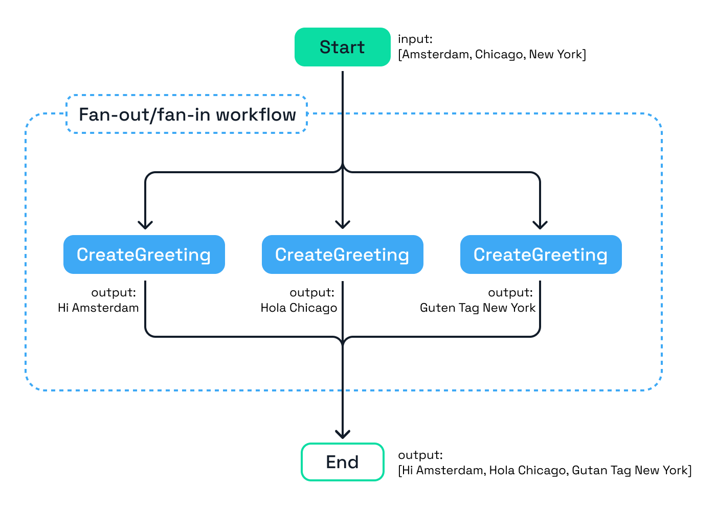 The FanOutFanInWorkflow sample in the GitHub repo contains a fan-out/fan-in pattern where for each name in the input, an activity call to execute a CreateGreetingActivity is created, but not immediately scheduled and executed. The result of the workflow is an array of three individual greetings.