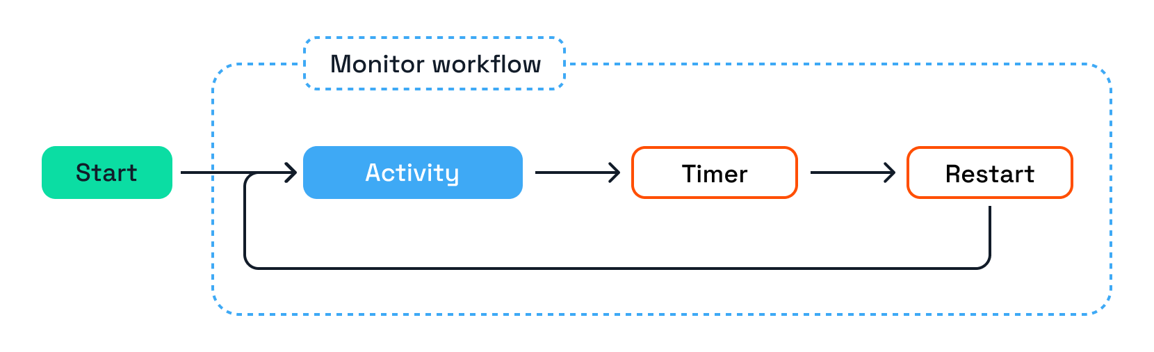 The purpose of the monitor pattern is to periodically execute one or more activities in a loop at a specified frequency, for example once every hour or daily at midnight. Occasionally, a condition is used that determines if the workflow is restarted or completed.