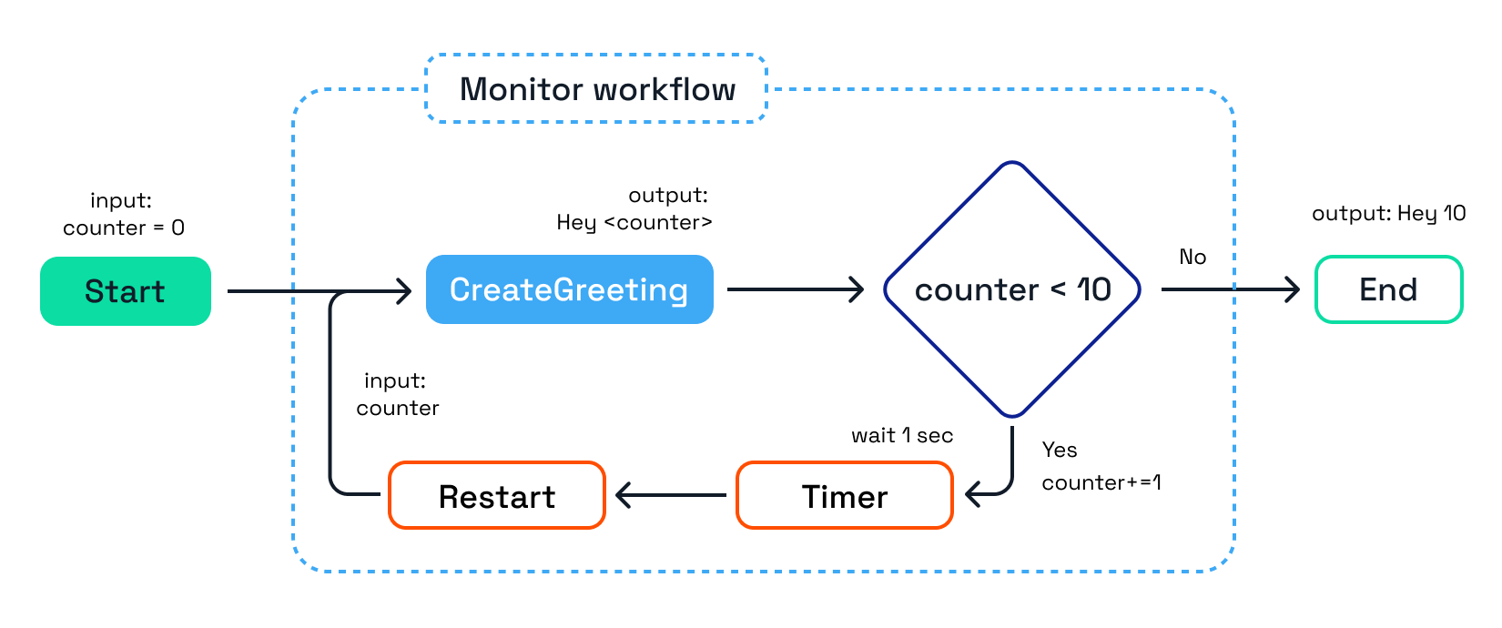 }Note that restarting the workflow is done by calling the ContinueAsNew method. This instructs the workflow engine to restart the workflow as a new instance without the previous (replay) data. The updated counter value is passed in as the input argument of the workflow.