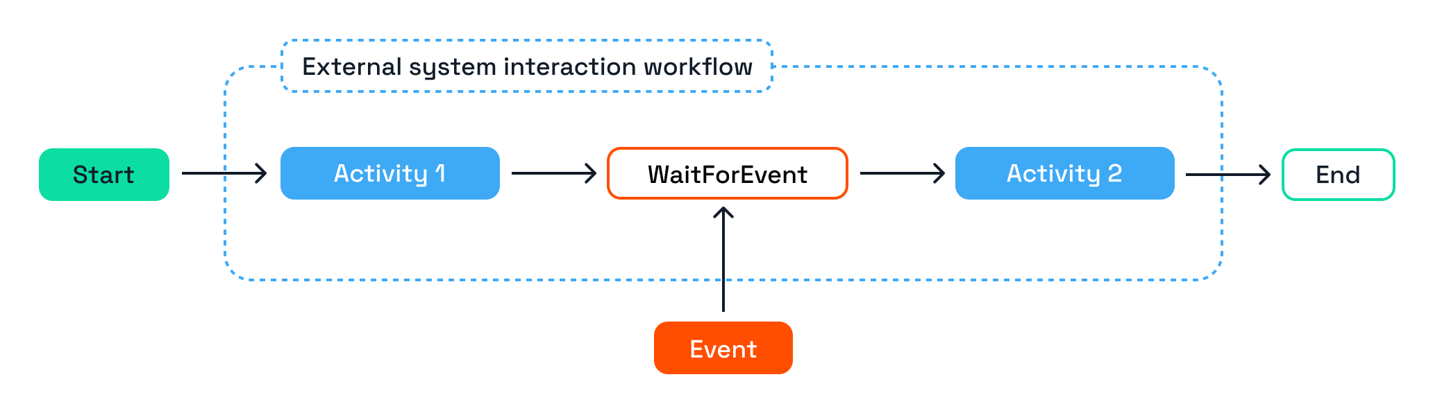 The purpose of the external system interaction pattern is to wait on the execution of a part of the workflow until an external system raises an event that is received by the workflow.