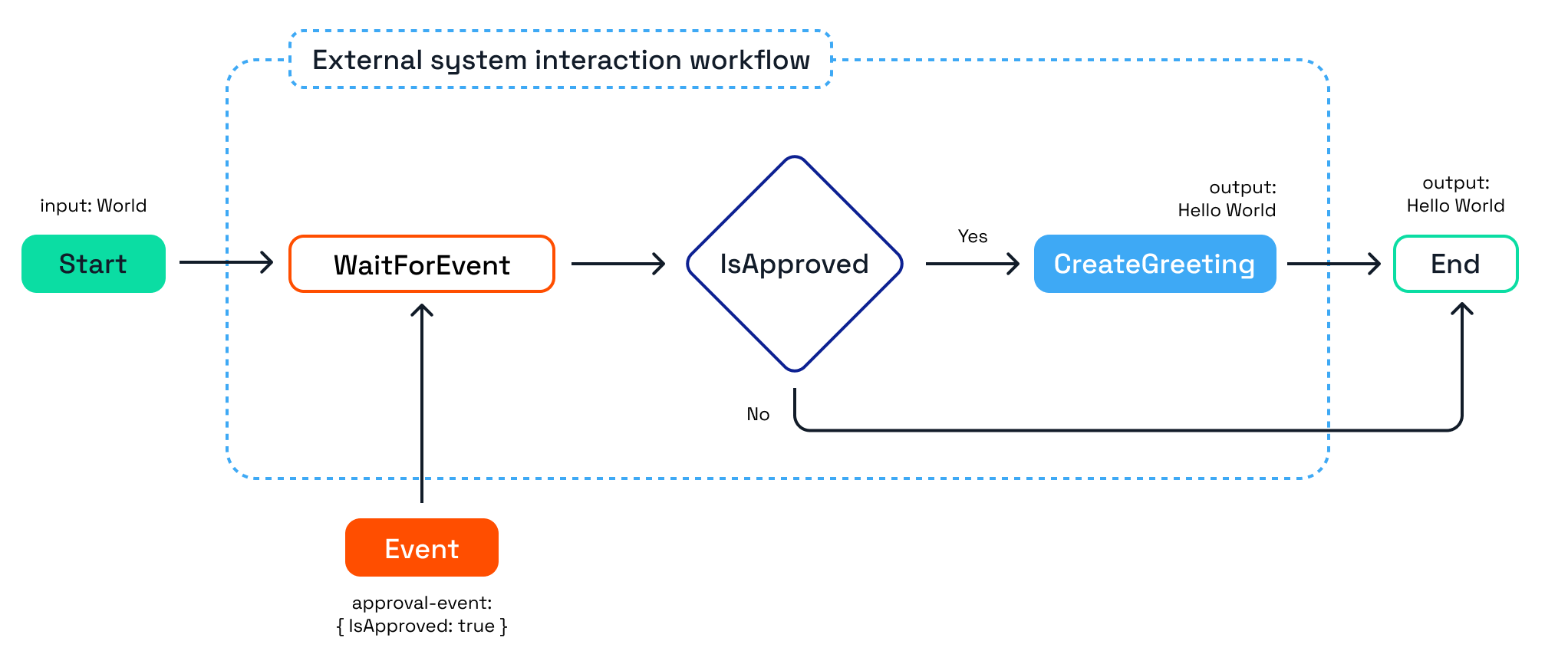 The ExternalInteractionWorkflow sample in the GitHub repo contains a workflow that will wait as soon as the workflow starts. The WaitForExternalEventAsync<T> method is used to instruct the workflow engine to wait with further execution until an event named “approval-event” has been received or the timeout of 20 seconds has expired. The ApprovalEvent is used as the generic output type parameter. This is the type the workflow expects to receive. It can be any user-defined serializable object.