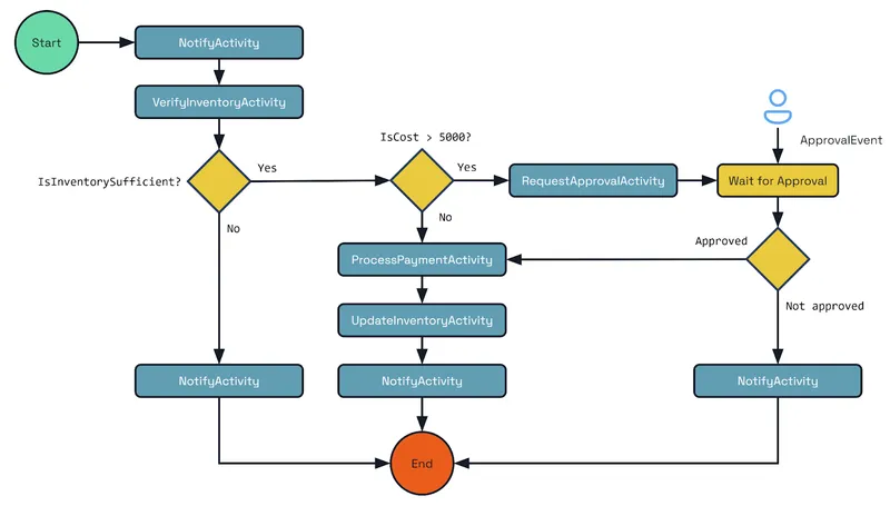 To make it more concrete, let’s consider a typical example: the "Order Processing Workflow" from the Dapr quickstart. This process verifies inventory, checks cost thresholds, and conditionally requests approval before proceeding. Here is the workflow.