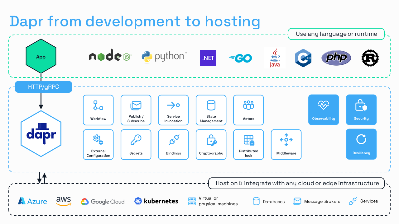 Dapr was created to streamline secure and reliable distributed application development, regardless of the programming language or cloud provider. Developers can use the suite of Dapr APIs via HTTP/gRPC, or via the many language SDKs, to build microservices quickly. Dapr is not only used during development, Dapr is also running in production, providing secure and reliable communication between services and resources on any cloud or on-premise.