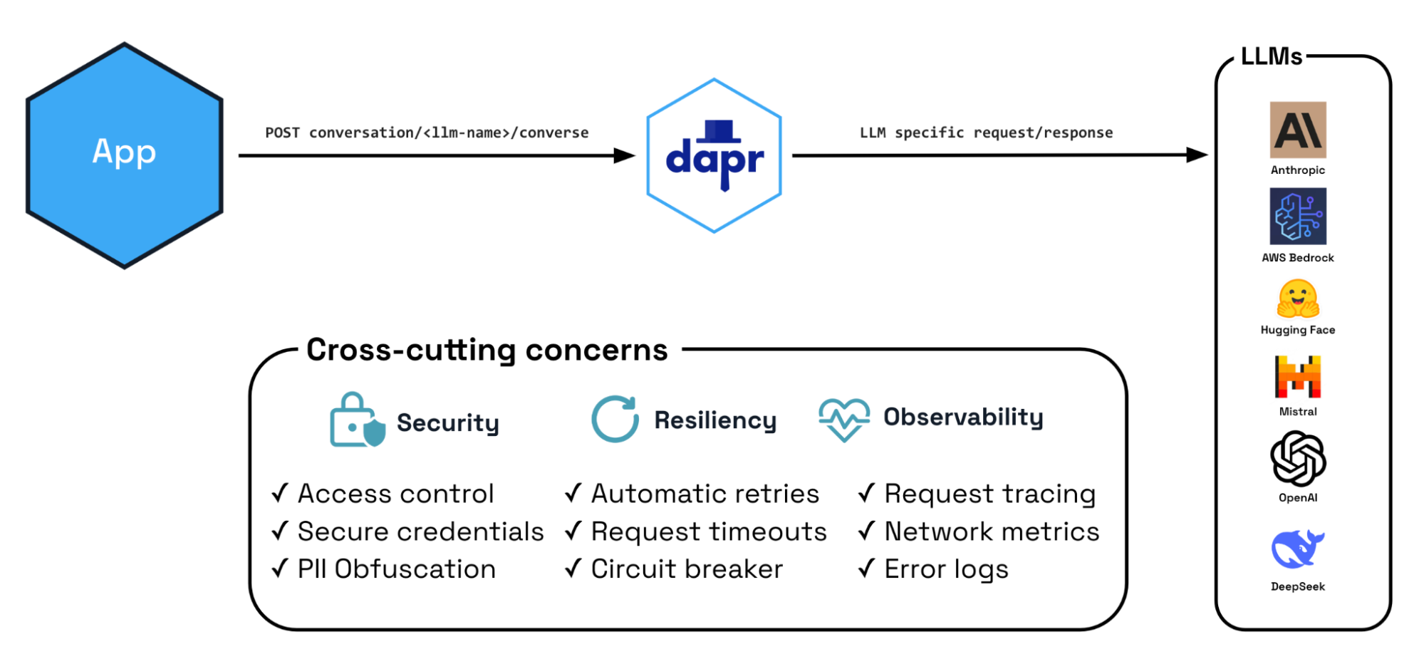 LLM interactions are part of the well-known distributed app challenges that often cross team boundaries. Integrating with LLM provider SDKs forces every team to solve these challenges independently, leading to duplicated effort and inconsistent implementations. What's needed is an abstraction layer that handles these common concerns while preserving provider-specific capabilities. This is precisely what Dapr's new Conversation API delivers.