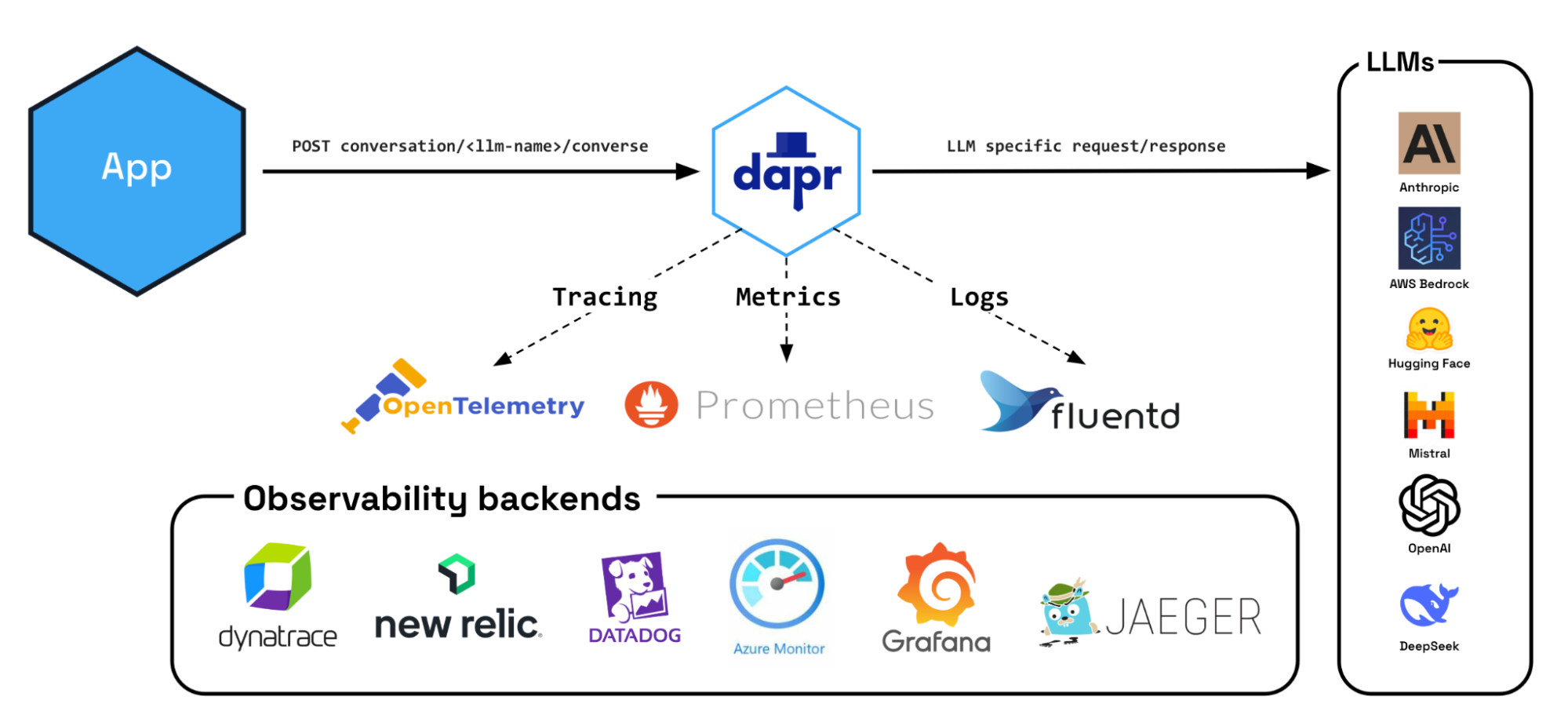 By implementing observability through industry-standard protocols like OpenTelemetry, W3C trace context, Prometheus metrics, and structured logging, Dapr ensures LLM operations aren't isolated from your existing monitoring infrastructure. This standards-based approach means operations teams can leverage their current observability stack (Jaeger, Zipkin, Prometheus, Grafana, Fluentd, etc.) without building and maintaining separate monitoring pipelines for AI components. The same dashboards, alerts, and runbooks that monitor your microservices can now seamlessly include LLM interactions as just another part of your distributed system.