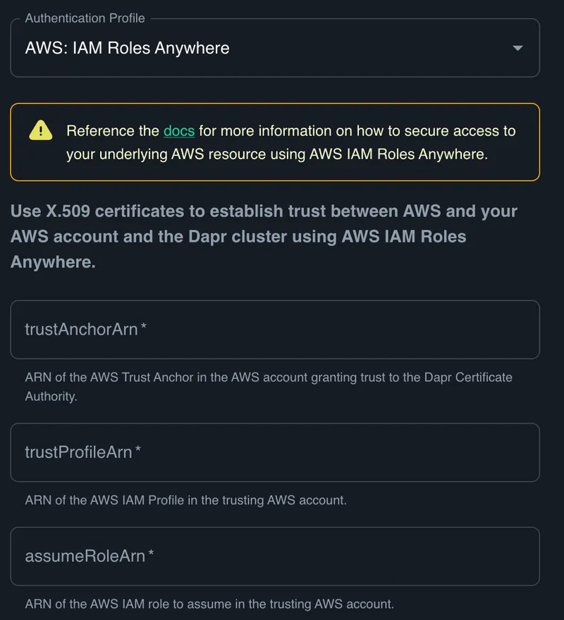 By contributing the IAM Roles Anywhere authentication profile to upstream Dapr, we’ve unified AWS authentication for all AWS components. This profile offers: