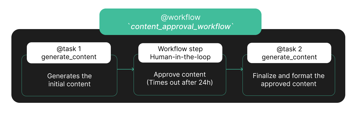 - Human-in-the-loop introduces approval gates using external event handling. The workflow can pause indefinitely while waiting for human input, survive system restarts, and continue exactly where it left off once approval arrives.