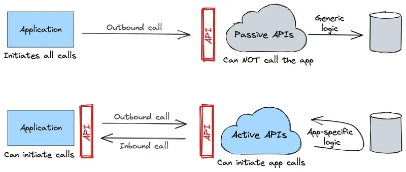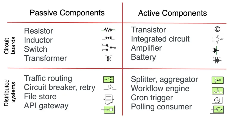 In electronics, there are interconnected components forming an elaborate system, performing complex functions. These components consist of passive components, such as resistors and capacitors that consume energy, and active components, like transistors and integrated circuits, that manipulate electricity in the form of voltage or current. This concept resembles distributed systems composed of multiple components deployed as processes and interacting over APIs. And similar to electronics, in software systems we have passive services that react to other stimuli, and active services that can generate events from within. These active APIs can trigger new interactions, orchestrate complex workflows, or alter the flow of data through aggregation and splitting.