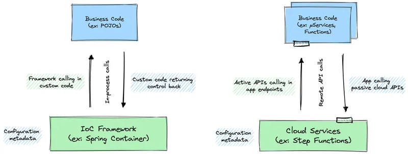 Active APIs offer a contrasting approach. Developers configure these APIs to modify requests, generate new events, and manage control logic. Their stateful and programmable nature makes them similar to distributed Inversion of Control (IoC) frameworks. Here, the active cloud APIs initiate communication with our application, a stark shift from traditional paradigms. This approach is akin to how the IoC principle delegated control to a framework from specific code modules, encapsulating complex logic and improving application flexibility, scalability, and reliability. By extending the IoC principle to the cloud level, applications can operate more decentrally and resiliently. This shift follows the "Hollywood Principle"—don't call us; we'll call you—on a grand scale, transforming the cloud from a mere infrastructure provider to an active participant in application logic.