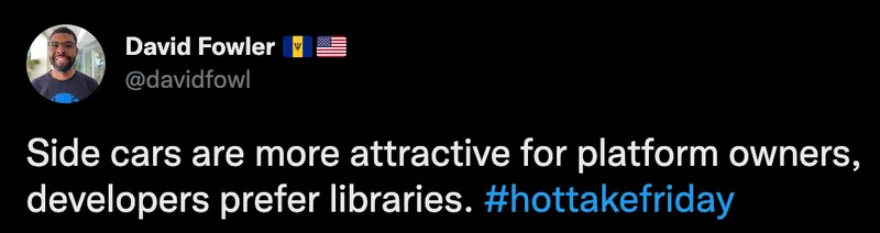 Now that we have a basic understanding of what a sidecar is, let's get back to the tweet and see how sidecars and libraries are not mutually exclusive concepts as portrayed.
