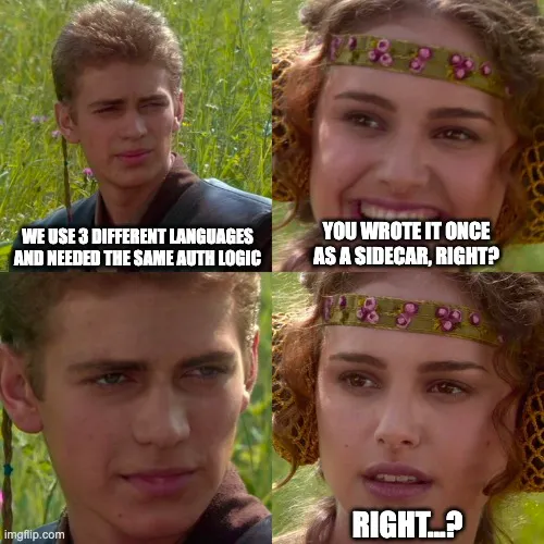 As illustrated in the above meme, the sidecar pattern is a great way for developers to maintain a single codebase in a language that's best positioned to solve the problem at hand, instead of maintaining multiple codebases when using a polyglot environment with services written in different languages.