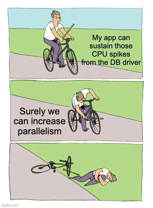 However, in high scale scenarios we can expect different usage patterns, much more dynamic and unpredictable in nature. As engineers we want to ensure our code operates reliably under load, but in the case described here, the different stages act as noisy neighbors to one another. A slowness in the database can delay thread execution which can lead to slower processing from the queue and cause CPU spikes.