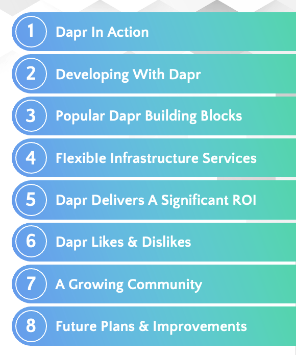 In addition, a series of in-depth interviews were conducted with ten Dapr users to gain an understanding of the nuances of Dapr adoption and use. Quotes from those interviews are included, edited for readability where necessary.