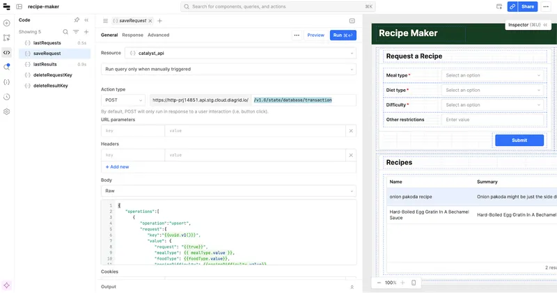 At this point, your Retool configuration is ready to interact with Catalyst and Neon, allowing you to request recipes and record user requests in the database The final goal is to populate the Recipes table in the bottom section of the screen, which will be covered in the next section.