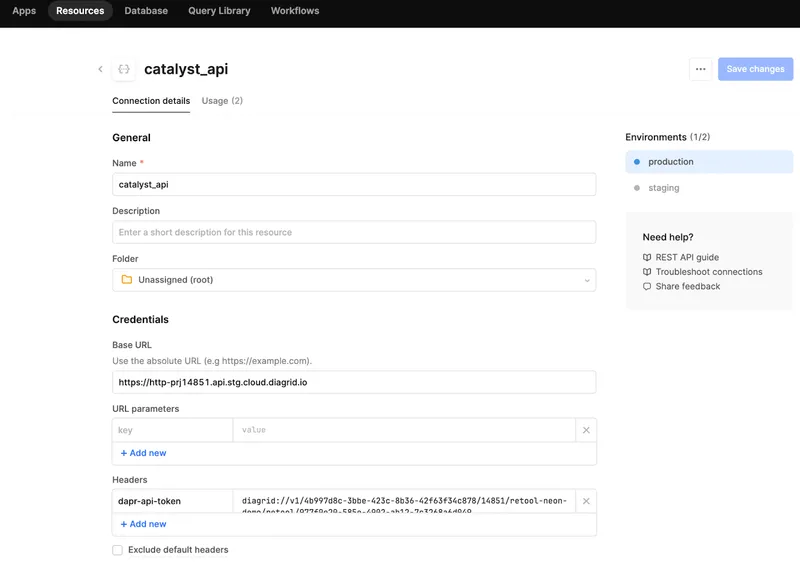 - Retool uses the concept of Apps for web applications and Resources for backing services. Create a resource that represents your Catalyst frontend App ID.