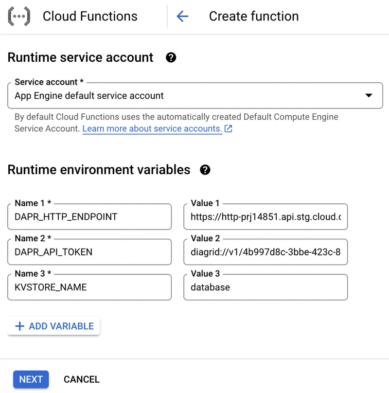Set Function Runtime environment variables