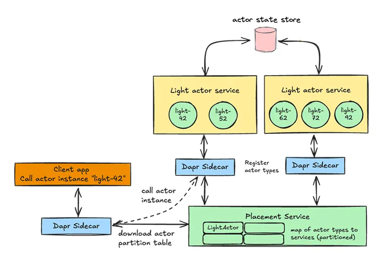 When a client calls an actor with a particular ID, for example, light-42, the Dapr instance for the client hashes the actor type and actor id and uses the information to call onto the corresponding Dapr instance that can serve the requests for that actor ID. See the dotted line in the diagram below, which uses the Dapr Service Invocation API to call the methods on the actor. As a result, the same partition (or service instance) is always called for any given actor ID.
