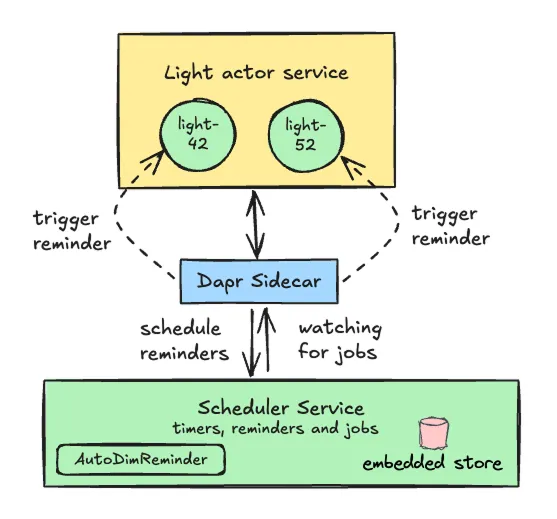Actors can schedule future work with timers and reminders. Actor Timers are in-process callbacks scheduled by the actor itself and are ephemeral in that they are used for short-lived events whilst the actor is in memory. Actor Reminders, on the other hand, are durable, persistent and fire even if the actor is deactivated. Both let actors run code in the future or on a recurring basis. The auto dim feature of the ILight actor uses a reminder. So how does this work? That’s where the Dapr Scheduler service comes in. The Scheduler is a Dapr control plane service responsible for centralized, reliable scheduling of jobs. It ensures that timers and reminders fire exactly when they should, where only the node hosting the actor processes gets the trigger event. It plays the same role for actor scheduling that the Placement service plays for actor activation.