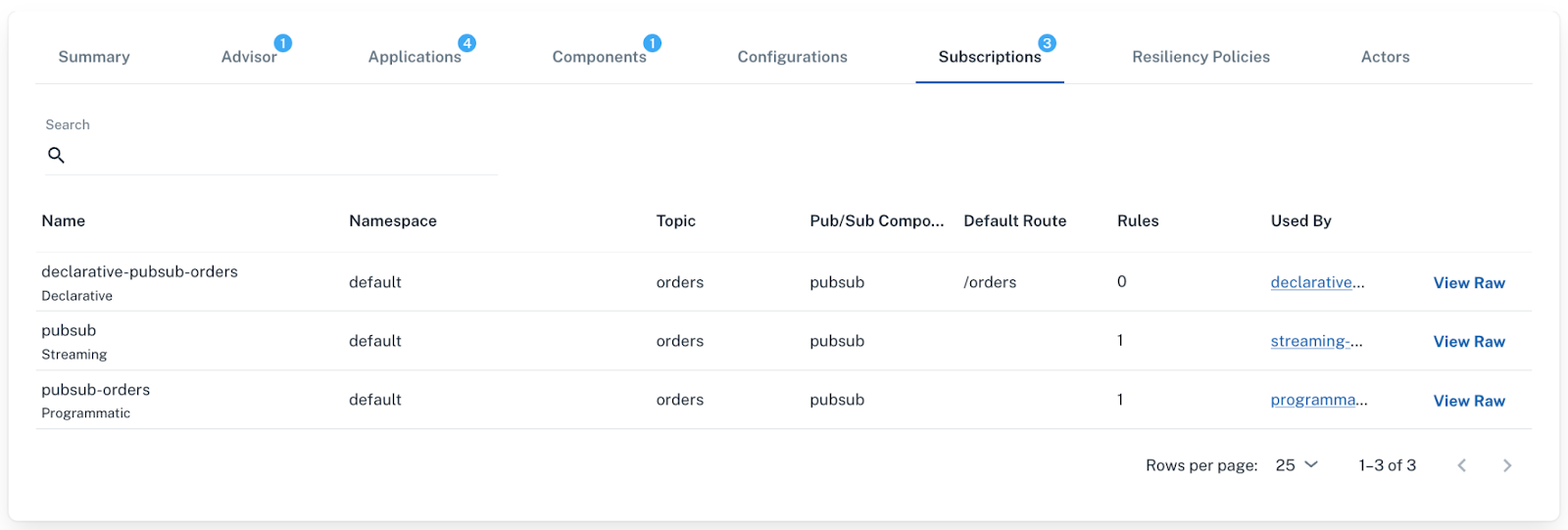 The three subscription types from the sample application shown in Diagrid Conductor.