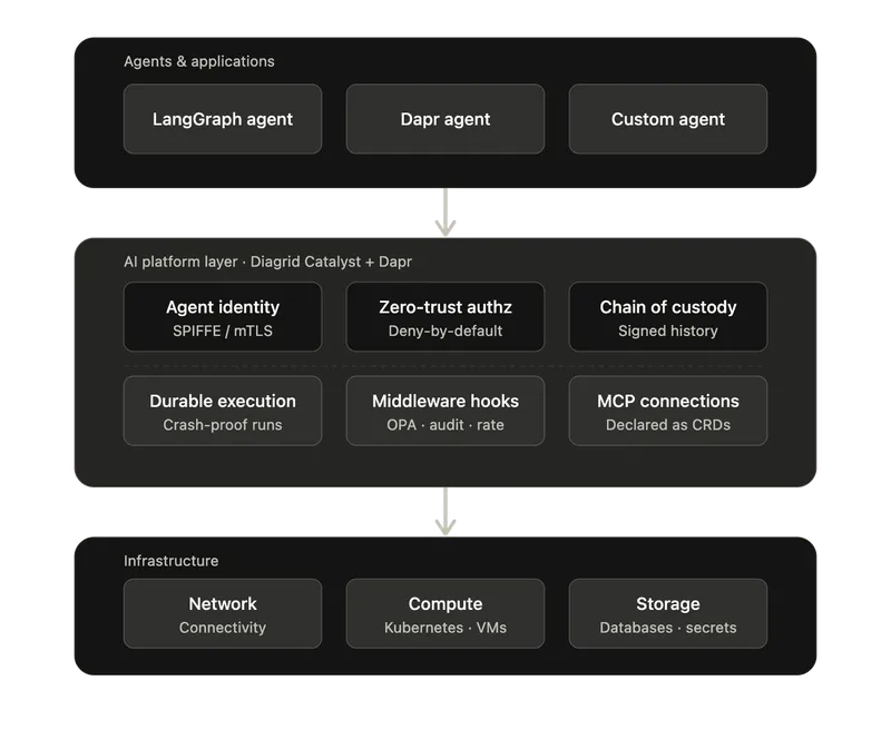 These are not theoretical requirements. Diagrid Catalyst, the managed platform for running Dapr-based applications and AI agents in production, provides all of this today.